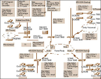 3524交換機,它們能支持330多部思科IP 電話。各城市間的站點通過幀中繼WAN互相連接。在夏洛特斯維爾,3個基本速率接口(PRI)線路提供與公眾交換電話網(PSTN)的連接。由于SNL