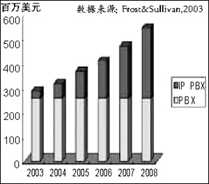 這幾年,IP電話的需求在不斷升溫,尤其在2003年呈快速增長趨勢。目前,全球IP電話市場容量每年為10億美元,預計到2008年,IP電話的市場份額將超過傳統(tǒng)的PBX。據(jù)思科公司溫帶策經(jīng)理介紹,思科在前4年,向全球銷售了100萬臺IP電話,而在2003財年僅僅一年時間里,就銷售了100萬臺IP電話。