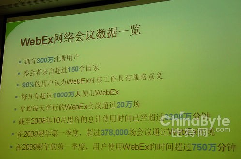 網(wǎng)絡(luò)會(huì)議在中國普及率還相對(duì)滯后,不同行業(yè)的跨度也不一樣,用WebEx做什么也有差異。制造業(yè)和高科技領(lǐng)域使用最廣,因?yàn)樗麄兿矚g學(xué)習(xí)使用高科技。目前正在向其他領(lǐng)域擴(kuò)展。比如目前阿里巴巴在用,也在慢慢擴(kuò)展到金融等行業(yè)。
