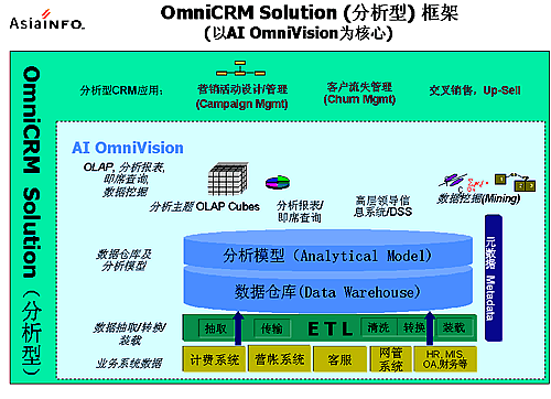 OmniCRM方案是亞信基于多年服務(wù)電信市場(chǎng)的豐富的行業(yè)經(jīng)驗(yàn),以及對(duì)國(guó)內(nèi)運(yùn)營(yíng)商業(yè)務(wù)發(fā)展的深刻認(rèn)識(shí)而推出的,其中,AI OmniVision是OmniCRM方案中經(jīng)營(yíng)分析型CRM 的核心產(chǎn)品。AI OmniVision不僅符合行業(yè)業(yè)務(wù)規(guī)范,而且基于對(duì)客戶行為、競(jìng)爭(zhēng)環(huán)境,商業(yè)獲利率以及其他參數(shù)的透徹分析,能夠使運(yùn)營(yíng)商充分了解現(xiàn)有客戶、識(shí)別并關(guān)注贏利的客戶組、提高服務(wù)質(zhì)量、確保客戶滿意度和忠誠(chéng)度;同時(shí)吸引潛在的客戶;加強(qiáng)提供新服務(wù)的投資回報(bào)率;提高效率、減小成本,以實(shí)現(xiàn)業(yè)務(wù)價(jià)值的最大化。AI OmniVision采用數(shù)據(jù)倉(cāng)庫(kù)、ETL、OLAP分析、靈活報(bào)表展現(xiàn)及數(shù)據(jù)挖掘等技術(shù),包含了用戶分析、業(yè)務(wù)分析、收益分析、大客戶分析、營(yíng)銷分析、競(jìng)爭(zhēng)分析、服務(wù)質(zhì)量、新業(yè)務(wù)分析等眾多功能模塊。