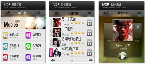 6)彩鈴定制業(yè)務(wù)。傳統(tǒng)彩鈴定制業(yè)務(wù)基于純語音IVR的環(huán)境下使用起來非常繁瑣,進行彩鈴檢索比較麻煩,選擇的準確度也很低。手機客戶端軟件的應(yīng)用,提供了可視化的交互方式,讓業(yè)務(wù)使用起來直觀便捷很多。用戶通過聲動魅力完成彩鈴信息的瀏覽、試聽、定制過程,用戶可以邊瀏歌曲的同時邊聽到語音對歌曲的介紹,并可試用該歌曲。下圖即為彩鈴定制業(yè)務(wù)操作界面:
