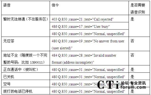 從歸納的情況看,只有無應答和地址不全兩種情況是可靠信令分析來識別的,其他的5種情況都無法通過信令檢測識別。特別是暫時無法接通的語言提示,播放完提示音有3種不同的信令,應該是屬于不同的情況,但是放了相同的語音。因此造成號碼識別錯誤的現象。