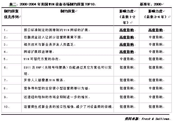 美國的WIN市場盡管處于強(qiáng)勢發(fā)展過程中,但這其中的變數(shù)也是有的。根據(jù)Frost & Sullivan 資料,2000-2004年間制約該市場發(fā)展的主要因素與影響力度見表二: