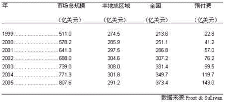 本地或區(qū)域價格方案在我們預測的時期內, 將始終是手機用戶采納的最多的一種方案。 1999年,在美國有5千7百 萬,大約70%的用戶是采用本地或區(qū)域方案, 而該方案產(chǎn)生的營業(yè)額為274.5億美元, 約占市場總規(guī)模的58.6%。Frost & Sullivan 預計,到2005年, 46.6%的手機用戶還會使用該種方案, 而該方案產(chǎn)生的營業(yè)額將為291.2億美元,占市場總規(guī)模的比例將縮至36.1%。