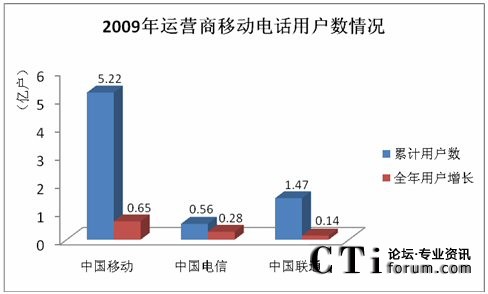 截至2009年12月31日,國內移動電話用戶累計達到74738.4萬戶,中國移動的用戶總數已達到5.22億戶,累計客戶凈增長6503.3萬戶,在三大運營商中,中國移動的用戶保有量和每月新增用戶數份額仍然最大。