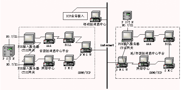 各地短消息中心各組成部分通過SNMP(簡(jiǎn)單網(wǎng)絡(luò)管理協(xié)議)/TCP相連,按照功能分為: