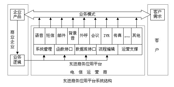從應用角度看,東進商務應用平臺將業(yè)務分為3個部分--企業(yè)端的業(yè)務邏輯、電信運營商端的業(yè)務實現(xiàn)和客戶端業(yè)務響應。企業(yè)根據(jù)其產(chǎn)品特點,制定相應的業(yè)務邏輯,去控制電信運營商的商務應用平臺,平臺在業(yè)務邏輯的控制下,去響應客戶端的業(yè)務需求,由此組成一個智能化的業(yè)務模式。