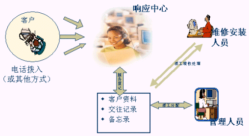 談起客戶服務(wù)部門的流程管理,我想許多有過(guò)這方面經(jīng)驗(yàn)的人可能會(huì)覺(jué)得頭大,因?yàn)樗婕碍h(huán)節(jié)多,如派工、配件管理、人員管理、總部對(duì)分公司的管理等等。因此,在服務(wù)管理系統(tǒng)中,就提供了一種自動(dòng)化的流程管理,涵概了服務(wù)部門的所有業(yè)務(wù)應(yīng)用,包含了客戶響應(yīng)處理、服務(wù)派工管理、配件管理、員工管理以及總部對(duì)分公司的管理等,迅速構(gòu)架公司總部與各地分公司溝通渠道,解決總部與分公司信息流轉(zhuǎn)的問(wèn)題。下圖反應(yīng)了服務(wù)流程管理過(guò)程。