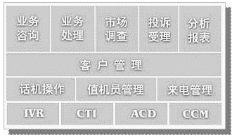 從技術(shù)實(shí)現(xiàn)的角度,劃分為四層。依次為呼叫中心系統(tǒng)層,應(yīng)用管理層、客戶管理層和業(yè)務(wù)應(yīng)用層。