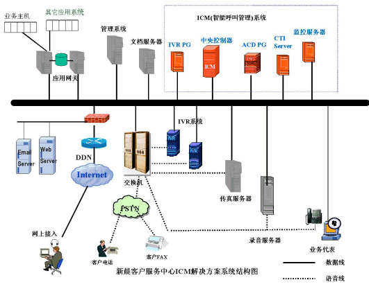 新晨客戶服務(wù)中心普及型解決方案是在以專用交換機(jī)或PC服務(wù)器加語音卡作為電話接入設(shè)備,如果用PC服務(wù)器加語音卡作為電話接入設(shè)備,將電話中繼線直接接到IVR上。此方案中的CTI系統(tǒng)能夠適用于流行的語音板卡和多種電話交換機(jī)的不同環(huán)境,這種解決方案主要針對(duì)小型的客戶服務(wù)中心推出。