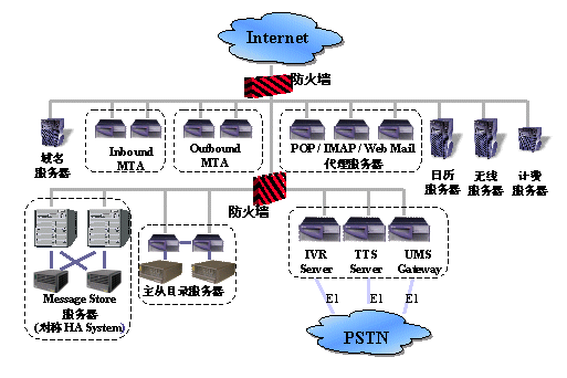 UMS系統(tǒng)的軟件采用Blue-Sillicon公司的UMS軟件,郵件系統(tǒng)為iPlanet Message Server 5.0(iMS 5.0)。Blue-Silicon公司的UMS軟件實(shí)現(xiàn)了上面我們所描述的功能,將電話、傳真和郵件和為一體,為用戶提供方便快捷的全方位信息服務(wù)。