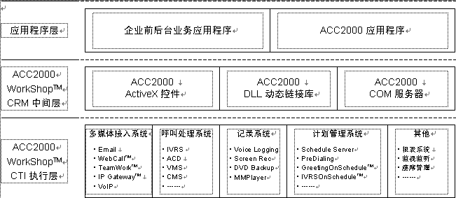 ACC2000 Workshop™是聲訊科技集團(tuán)為基于Microsoft Windows操作系統(tǒng)的CRM應(yīng)用軟件開(kāi)發(fā)所建立的開(kāi)發(fā)平臺(tái)(中間件)。以ACC2000 Workshop™為基礎(chǔ)的ACC2000集成多媒體溝通中心采用三層結(jié)構(gòu),利用ACC2000 Workshop™的CRM中間層所提供的ActiveX控件、DLL動(dòng)態(tài)庫(kù)以及COM組件,就可以很容易地將溝通中心的各種功能融合到前端應(yīng)用程序中。ACC2000 Workshop™的CTI執(zhí)行層接受中間件發(fā)來(lái)的請(qǐng)求,處理ACC2000的各項(xiàng)服務(wù)功能,并向CRM應(yīng)用程序返回執(zhí)行結(jié)果。見(jiàn)下圖。