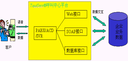 SQL Server,MySQL等多種數(shù)據(jù)庫;通過HTTP調(diào)用第三方WEB程序,通過SOAP協(xié)議調(diào)用Web Server上的服務(wù),從而利用外部應(yīng)用進(jìn)一步加強IVR的功能;用戶只需做一些簡單配置就可以實現(xiàn)電話訪問數(shù)據(jù)庫、WEB和業(yè)務(wù)系統(tǒng)。如圖所示: