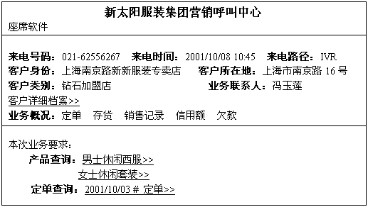 呼叫中心是以CTI技術為根本的,它的長項就在于能把計算機系統(tǒng)與電話系統(tǒng)集成起來。在呼叫中心所集成的計算機系統(tǒng)中,除了呼叫中心本身的應用軟件外,更重要的就是與ERP(企業(yè)資源計劃)系統(tǒng)集成后產生的功能強大的座席端應用軟件。實際上,與ERP系統(tǒng)無縫連接的座席端應用軟件,很容易就能擴充為一個簡單的CRM(客戶關系管理)系統(tǒng)。這時,呼叫中心就真正成了服裝生產商整個運營管理體系中的溝通樞紐和響應中心。