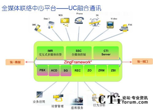 英立訊公司ZingFramework®®全媒體聯(lián)絡(luò)中心平臺基于H.323和SIP等國際標準協(xié)議,通過SOA服務(wù)架構(gòu)實現(xiàn)聯(lián)絡(luò)中心的優(yōu)化計算,為客戶應(yīng)用提供了多媒體服務(wù)處理能力,支持固話、手機、傳真、郵件、短信、互聯(lián)網(wǎng)和Web電話等多種通信方式的接入,以及3G視頻互動和RFID物聯(lián)應(yīng)用,實現(xiàn)多種服務(wù)媒體和通訊渠道的統(tǒng)一融合,并提供統(tǒng)一接入、統(tǒng)一路由、統(tǒng)一排隊、統(tǒng)一服務(wù)、統(tǒng)一處理和回復的的綜合融合通訊服務(wù)平臺。