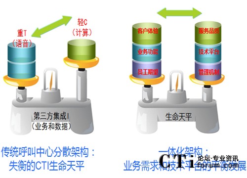 因此很長一段時間以來呼叫中心都作為語音通訊的分支之一而存在,而這種定位給呼叫中心的生命力帶來了不平衡的發(fā)展,根源就在于“輕C重T第三方集成I”的格局:語音處理性能和功能強大,計算能力和數(shù)據(jù)處理弱,因此將業(yè)務集成和數(shù)據(jù)集成交由第三方承擔。因此很長一段時間,造成呼叫中心在企業(yè)購買之后對業(yè)務應用的適應能力差、業(yè)務發(fā)展和變化時系統(tǒng)穩(wěn)定性變的無法保證。