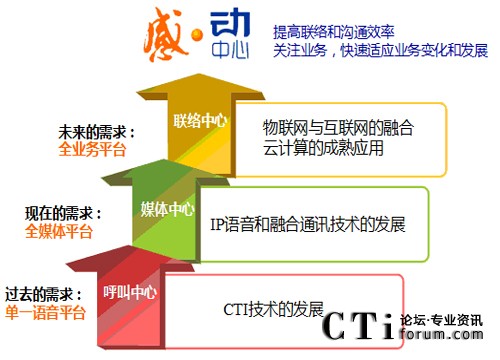 這是“感•動中心”的主旨,完全以客戶的業(yè)務為出發(fā)點,體現(xiàn)“以客戶為中心”的理念。而“全景中心”、“聯(lián)絡中心”等以純技術為中心,還停留在多媒體通訊和UC通訊手段融合層面,只是新增加了一些新方式的接入等技術,對于客戶業(yè)務的融合和適應,并沒有任何提升。