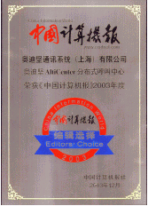 奧迪堅(jiān)基于IP分布式呼叫中心平臺榮獲中國計(jì)算機(jī)報(bào)2003年度編輯推薦獎(jiǎng)!吨袊(jì)算機(jī)報(bào)》(CIW-China