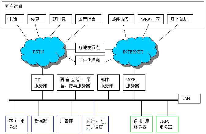 硬件方面,采用價格經(jīng)濟(jì)、功能靈活的基于語音板卡的呼叫中心平臺。在軟件方面,采用高可靠性的實時LINUX操作系統(tǒng)。具有高效、穩(wěn)定、安全以及功能齊全等特點。坐席端軟件實現(xiàn)了強(qiáng)大電話處理功能,支持實時錄音、兼聽、強(qiáng)插、強(qiáng)拆等應(yīng)用;跒g覽器的瘦客戶端與CRM的客戶界面完美融合。并且提供詳盡的報表功能。支持智能化路由、多種排隊策略的選擇,實現(xiàn)與CRM無縫結(jié)合。