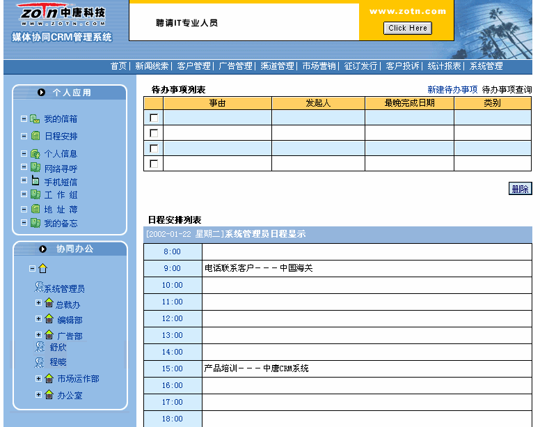 協(xié)同CRM實現(xiàn)單位內(nèi)部各個部門、各地分支機(jī)構(gòu)、代理商以客戶為中心協(xié)同工作,具體功能包括對新聞線索的管理,對廣告的管理,對征訂發(fā)行的管理,客戶反饋的管理,客戶信息分析決策,競爭對手管理、檢索統(tǒng)計輸出、系統(tǒng)維護(hù)等模塊。