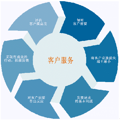 客戶服務(wù)不僅限于把公司提供給客戶使用。客戶服務(wù)是與客戶交互的一個(gè)完整過(guò)程,包括聽(tīng)取客戶的問(wèn)題和要求,對(duì)客戶的需要作出反應(yīng)并探詢客戶新的需求。我們真的不能將其看成一個(gè)簡(jiǎn)單的過(guò)程?蛻舴⻊(wù)可以用一個(gè)復(fù)雜的循環(huán)來(lái)表示,其中不僅僅包括了客戶和客戶服務(wù)部門,實(shí)際上包括了整個(gè)公司,即把公司整體作為一個(gè)受客戶需求驅(qū)動(dòng)的對(duì)象。