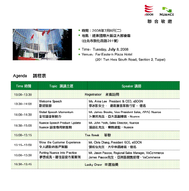 2008“Nuance語音技術(shù)高峰論壇”臺北站7月8日將于遠(yuǎn)東國際大飯店舉行