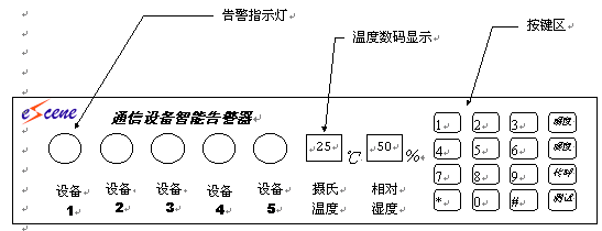 本告警器通過外接傳感器測量機(jī)房溫、濕度。測量值以數(shù)字形式直接顯示在前面板上。當(dāng)測量值超出預(yù)先設(shè)定的門限時,本機(jī)立即發(fā)出報警。門限值可通過前面板上按鍵來進(jìn)行設(shè)定。傳感器通過四蕊電話線與本機(jī)相連,連線距離可達(dá)3公里。