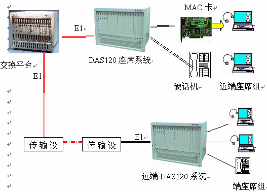 DAS120交換平臺(tái)采用1-4個(gè)E1連接,可以簡潔實(shí)現(xiàn)PCM信號轉(zhuǎn)模擬信號引出到座席。E1接口的信令可選配為隨路信令CAS和透明通道Clear Channel。E1可通過光端機(jī)、微波、HDSL等設(shè)備來傳輸,從而實(shí)現(xiàn)分布式組網(wǎng)。