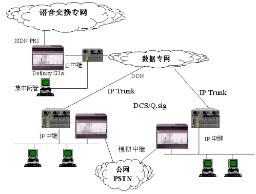 隨著IP網(wǎng)絡(luò)技術(shù)的不斷發(fā)展,數(shù)據(jù)網(wǎng)絡(luò)的融合能力越來越強(qiáng)。AVAYA在全球范圍內(nèi)率先推出全面符合H.323標(biāo)準(zhǔn)的VoIP解決方案及基于IP中繼的DCS/Q.sig專網(wǎng)透明功能信令。通過IP中繼將公司全部分支包括機(jī)構(gòu)的DEFINITY交換機(jī)進(jìn)行連接,同樣可以提供全面的專網(wǎng)透明功能和網(wǎng)絡(luò)呼叫中心應(yīng)用,DEFINITY IP中繼可提供豐富的語(yǔ)音壓縮能力,從64Kbps的無壓縮傳輸?shù)?Kbps的經(jīng)濟(jì)傳輸方案均可提供,同時(shí)通過復(fù)用在IP包中的DCS/Q.sig信令提供透明功能。