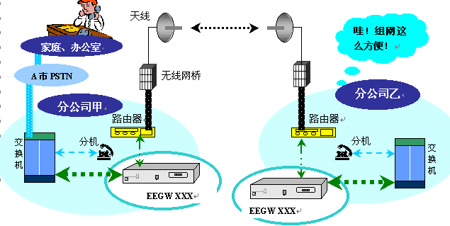 現(xiàn)今的計算機網(wǎng)絡建設中,多以DDN為主的局域網(wǎng)互連,往往由于DDN線路不能到達或要求專用內(nèi)部通道等原因,建設以無線為室外主要網(wǎng)絡通道的數(shù)據(jù)通信平臺,配合IP語音網(wǎng)關形成內(nèi)部的語音通信系統(tǒng),不僅建設簡單(無須各種市政管理部門的批復),并且造價較低,快速有效地解決數(shù)據(jù)互連及建立專用安全保密的內(nèi)部語音系統(tǒng)。