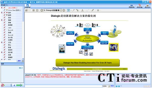 期間,Dialogic還以互動方式講解了3G IVVR與3G多媒體IP呼叫中心的業(yè)務(wù)及方案,并對基于3G視頻呼叫的視頻監(jiān)控業(yè)務(wù)進(jìn)行現(xiàn)場演示,并就時下Dialogic技術(shù)趨勢與觀眾進(jìn)行了互動。參與此次網(wǎng)絡(luò)研討會的參與者近百人,涉及多家網(wǎng)絡(luò)運(yùn)營商、設(shè)備制造商、增值分銷商、系統(tǒng)集成商。