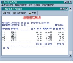 - 每種電話明細(xì)報(bào)表皆有提供通話日期、時(shí)間、外線號(hào)碼、外撥電話號(hào)碼、外撥電話類(lèi)別、通話通數(shù)、通話時(shí)間、通話金額、外撥區(qū)域之資料,而且還提供資料匯總。
