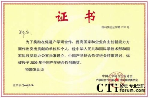 CTI論壇(ctiforum)11月26日消息(記者 潘婷):2009年11月7日,得意公司董事長(zhǎng)鄭方博士獲中國(guó)產(chǎn)學(xué)研合作促進(jìn)會(huì)2009年度中國(guó)產(chǎn)學(xué)研合作創(chuàng)新獎(jiǎng)。該獎(jiǎng)勵(lì)是面向國(guó)內(nèi)在促進(jìn)產(chǎn)學(xué)研合作及創(chuàng)新方面做出突出貢獻(xiàn)的單位及個(gè)人所頒發(fā)的年度榮譽(yù)獎(jiǎng)。