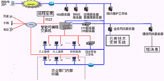 客戶(hù)利用電話、傳真、手機(jī)等撥打統(tǒng)一的特服號(hào)碼(如800XXX或9XXXX)或因特網(wǎng)進(jìn)入農(nóng)業(yè)分布式呼叫中心,本系統(tǒng)依托農(nóng)業(yè)部門(mén)各類(lèi)計(jì)算機(jī)業(yè)務(wù)技術(shù)支持系統(tǒng)和網(wǎng)絡(luò)系統(tǒng),實(shí)現(xiàn)與農(nóng)業(yè)部門(mén)原有管理系統(tǒng)/業(yè)務(wù)系統(tǒng)及數(shù)據(jù)庫(kù)的無(wú)縫連接,通過(guò)人工受理或自動(dòng)語(yǔ)音服務(wù)等方式全天24小時(shí)不間斷地為客戶(hù)提供各種服務(wù)。