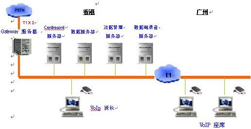 于本年一月初,基于Concerto Software平臺建設(shè)的中港跨境呼叫中心正式由本公司替GIS于香港及廣州開通。初期于廣州之座席數(shù)目為24。廣州與香港間透過1條E1專線連接。(結(jié)構(gòu)如下)