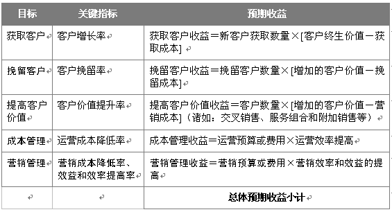 "效益目標" 這一戰(zhàn)略考慮是設(shè)定企業(yè)客戶關(guān)系管理戰(zhàn)略中的針對細分客戶的收益目標,與之相關(guān)聯(lián)的戰(zhàn)略重點是最大化針對細分客戶的客戶價值。這一部分將對以后工作中的客戶關(guān)系管理客戶收益提供方向和評估方法。
