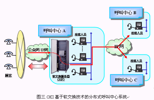軟交換(Soft Switch)技術(shù)的出現(xiàn)實(shí)現(xiàn)了上述想法。目前,采用軟交換技術(shù)的呼叫中心已經(jīng)在中國市場(chǎng)展露頭角。其中,日本通信企業(yè)沖電氣(OKI)工業(yè)株式會(huì)社在中國推出的以軟交換為核心技術(shù)的新一代呼叫中心是較為典型的代表。