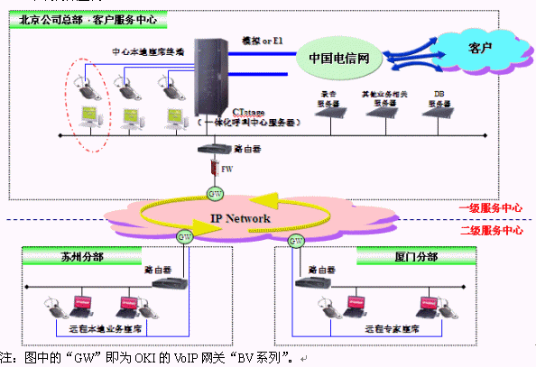 OKI的IP客服中心可以將各個分點和服務器間用VoIP網關連接。OKI的VoIP網關"BV系列",是在"MOS(Mean Opinion Score)"和"PESQ(Perceptual