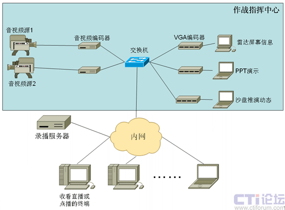 圖2所示的錄播系統(tǒng)可以同步錄制2路音視頻信號和3路電腦屏幕信號。音視頻信號可以是對抗雙方的實時畫面,而電腦屏幕信號則可以是指揮中心里的各種指揮輔助系統(tǒng)的顯示,如雷達屏幕信息、沙盤推演動態(tài)、作戰(zhàn)計劃以及戰(zhàn)情匯報的ppt演示,所有這些內(nèi)容都可以非常方便地同步錄制下來。內(nèi)網(wǎng)里的所有有權(quán)限的人員都可以實時收看這些內(nèi)容,同時,這些存儲下來的內(nèi)容也可以進行事后點播,用于分析、講評。
