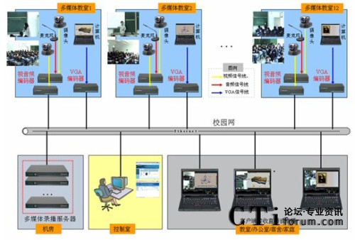 華東師大多媒體錄播項目系統(tǒng)組網(wǎng)如上圖所示。在本項目中12間多媒體教室內(nèi)均實現(xiàn)錄播功能,編碼器和多媒體錄播服務(wù)器分別部署在教室和機房內(nèi),管理員在控制室通過網(wǎng)絡(luò)進行遠(yuǎn)程管理、控制,老師、學(xué)生可在教室、辦公室、宿舍等任何可以連接校園網(wǎng)的地方實時觀看各間教室內(nèi)進行的課程,可滿足日常多媒體教學(xué)、課件錄制、微格教學(xué)等應(yīng)用的需要。其中涉及銳取設(shè)備清單及說明如下: