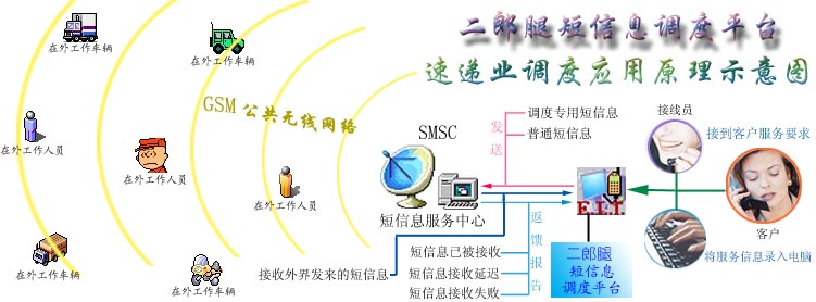 二郎腿短信息調(diào)度平臺是利用目前社會上大眾普遍擁有手機的現(xiàn)成資源,通過移動通訊公司提供的短信息服務(wù)功能作為通信信道,直接對手機進(jìn)行低層操作控制,以“收發(fā)短信息”的方式來實現(xiàn)信息的傳遞(通信資費標(biāo)準(zhǔn)與在手機上收發(fā)短信相同)。調(diào)度平臺還對每條發(fā)出的信息的接收狀態(tài)進(jìn)行跟蹤,確保信息能被安全