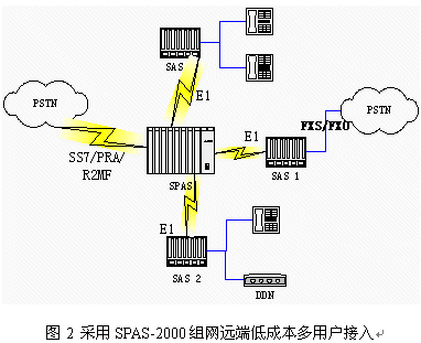 SPAS可編程交換機(jī)通過(guò)E1可以支持多個(gè)遠(yuǎn)端模塊。遠(yuǎn)端模塊采用SPAS-SAS框,可以帶多種用戶(hù)接口:普通模擬用戶(hù)、DDN、環(huán)路中繼用戶(hù);通過(guò) SPAS主模塊對(duì)外提供各種信令接入。適合多點(diǎn)接入組網(wǎng),且組網(wǎng)成本低。組網(wǎng)圖見(jiàn)圖2: