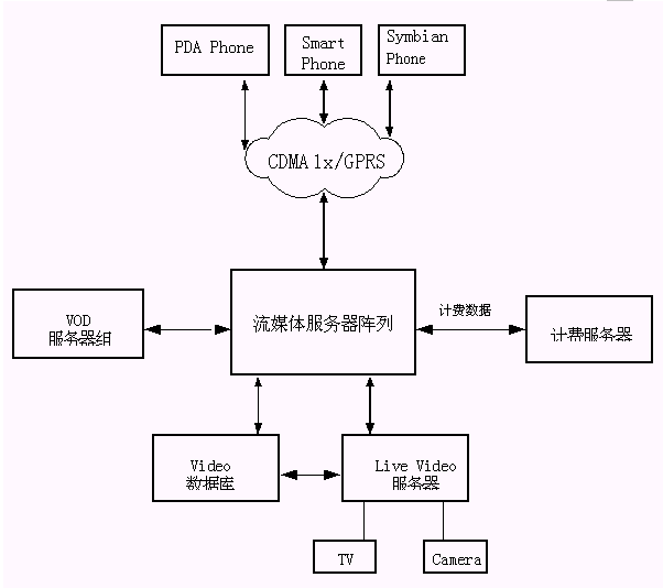 根據(jù)中國2.5網(wǎng)絡(luò)的特點,結(jié)合我們自身的技術(shù)和系統(tǒng)解決方案的優(yōu)勢,我們針對CDMA1X網(wǎng)絡(luò)推出了移動VOD,增強型移動視頻郵件、移動可視電話的系統(tǒng)解決方案。在GPRS網(wǎng)絡(luò)上則推出了移動音頻點播業(yè)務(wù),移動視頻郵件業(yè)務(wù)。下面我們對這些業(yè)務(wù)做具體描述。