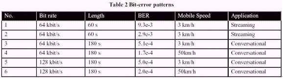 在H.264/AVC的標(biāo)準(zhǔn)化進(jìn)程中,移動(dòng)視頻傳輸?shù)闹匾砸呀?jīng)在3G移動(dòng)傳輸里面通過對(duì)基于H.324M的電路交換會(huì)話服務(wù)、包交換會(huì)話和流服務(wù)得到了證實(shí)。這些測(cè)試情況允許適當(dāng)?shù)木幋a特征、測(cè)試和容錯(cuò)仿真等特征的選擇,同時(shí)也可以得到有意義的測(cè)試結(jié)果。在本文,我們將會(huì)把重心集中在基于IP的測(cè)試情況。在正常的測(cè)試情況下,我們會(huì)定義6個(gè)測(cè)試情形組合,主要測(cè)試通過3G移動(dòng)網(wǎng)絡(luò)的包交換會(huì)話服務(wù)和包交換流媒體服務(wù)。另外,測(cè)試環(huán)境包括簡(jiǎn)單的脫機(jī)3GPP/3GPP2仿真軟件、程序接口和評(píng)估標(biāo)準(zhǔn)。無線信道使用專門生產(chǎn)用于移動(dòng)無線信道仿真的位率差錯(cuò)模板來進(jìn)行仿真。 位率差錯(cuò)模板在物理層上和RLC/RLP層下來捕獲,因此,它們?cè)趯?shí)驗(yàn)被用于物理層仿真。通過位率差錯(cuò)模板實(shí)驗(yàn)中得出的碼率、長度、位錯(cuò)誤率和移動(dòng)速度數(shù)據(jù)詳見下表2。