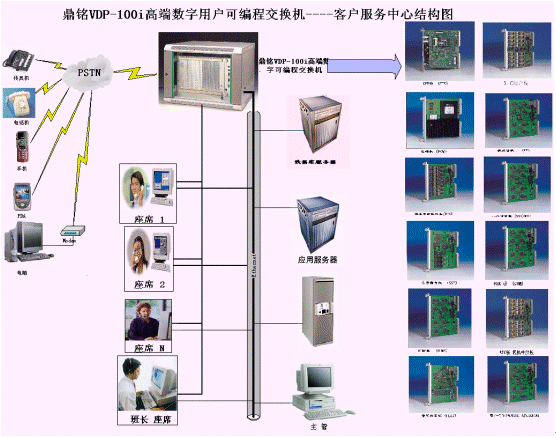 接入平臺實現外界接入的控制和話務交換、資源的合理分配,是構建呼叫中心的成功關鍵所在。DM大型呼叫中心系統(tǒng)接入平臺采用鼎銘VDP-100i高端數字可編程交換機,該交換機所有資源板卡都采用了高集成度、功能模塊設計思想。該接入平臺的結構如上圖所示的右邊(詳細的功能模塊資源板請參閱《鼎銘高端數字可編程交換機產品手冊》),用戶可以根據實際情況靈活配置和增減系統(tǒng)的接入方式、資源類型、資源數量,達到資源的充分合理利用的目的。