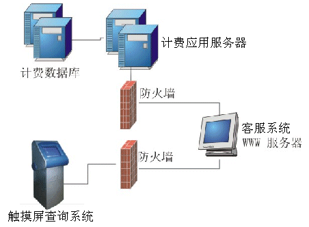 。。觸摸屏查詢系統(tǒng)通過WWW方式訪問鐵通客服系統(tǒng)的WEB服務(wù)器,再由WEB服務(wù)器訪問計費系統(tǒng)的應(yīng)用服務(wù)器,由應(yīng)用服務(wù)器上的代理訪問計費系統(tǒng)的數(shù)據(jù)庫。由于觸摸屏查詢系統(tǒng)與客服系統(tǒng)WEB服務(wù)器之間、客服系統(tǒng)WEB服務(wù)器與計費應(yīng)用服務(wù)器每層都有網(wǎng)絡(luò)防火墻進(jìn)行隔離,同時客服系統(tǒng)的WEB服務(wù)器并不直接訪問計費數(shù)據(jù)庫,因此可以保證計費系統(tǒng)的數(shù)據(jù)安全。在觸摸屏上用戶除了訪問系統(tǒng)提供的功能以外,不能做任何操作,再次保證了系統(tǒng)的安全可靠。