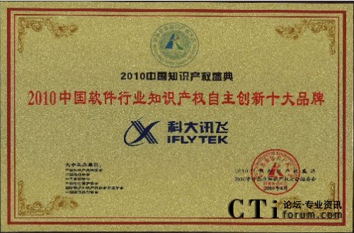 CTI論壇(ctiforum)4月29日消息(記者 潘婷婷):2010年4月25日,由中國知識產(chǎn)權研究會、中國專利保護協(xié)會、中國版權協(xié)會等單位聯(lián)合舉辦的“2010中外企業(yè)知識產(chǎn)權大會”在人民大會堂隆重舉行。在當日的“2010中國知識產(chǎn)權盛典頒獎典禮”中,科大訊飛憑借強大的自主創(chuàng)新能力以及在知識產(chǎn)權創(chuàng)造、保護與應用方面的突出表現(xiàn)獲評“2010年中國軟件行業(yè)知識產(chǎn)權自主創(chuàng)新十大品牌”。