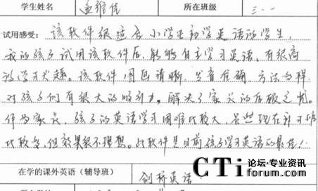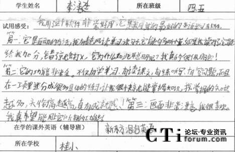 CTI論壇(ctiforum)1月21日消息(記者 潘婷婷):2010年12月,科大訊飛在天津市的兩所小學(xué)舉辦了暢言互動(dòng)英語(yǔ)學(xué)生版試用體驗(yàn)活動(dòng),同學(xué)們積極參與,在校園內(nèi)掀起了一股練聽力、學(xué)口語(yǔ)的英語(yǔ)學(xué)習(xí)熱潮。通過(guò)實(shí)際試用體驗(yàn),暢言互動(dòng)英語(yǔ)學(xué)生版學(xué)習(xí)產(chǎn)品以其強(qiáng)大、實(shí)用的學(xué)習(xí)功能,得到了廣大家長(zhǎng)、學(xué)校師生的一致認(rèn)可和充分肯定。