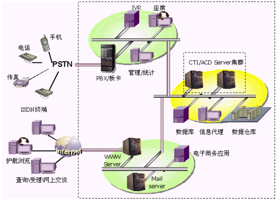 將PSTN訪問、Internet訪問有機結(jié)合,對傳統(tǒng)呼叫中心進(jìn)行擴充,支持多種接入方式,多種交流渠道,具有傳統(tǒng)呼叫中心無法比擬的優(yōu)越性。