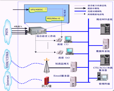 根據(jù)縣級(jí)供電公司用戶數(shù)量分析,一個(gè)縣級(jí)供電公司95598系統(tǒng)規(guī)模配置為4~16條模擬電話線接入,2~4線傳真資源,4~8個(gè)座席。少數(shù)相對(duì)比較大的縣供電公司,可能擴(kuò)容到30路電話(E1,數(shù)字中繼)的外線接入。本次系統(tǒng)規(guī)模需求為4線接入、4路傳真、4路自動(dòng)語(yǔ)音IVR和4個(gè)人工座席,并實(shí)現(xiàn)文本轉(zhuǎn)語(yǔ)音TTS和短消息服務(wù)功能。